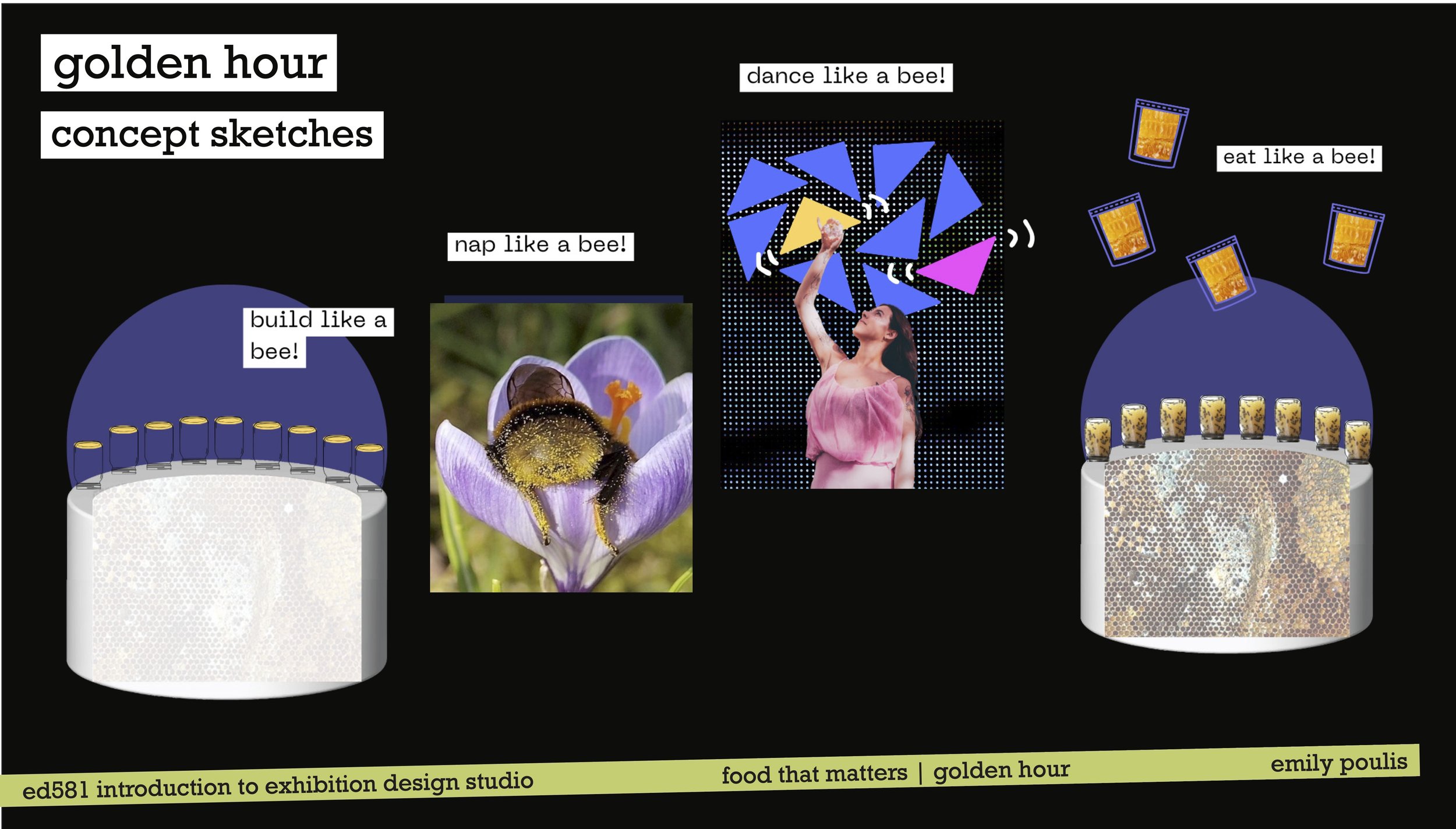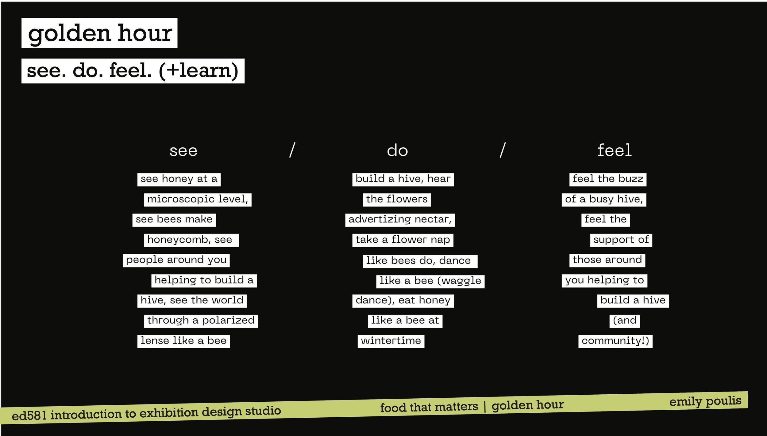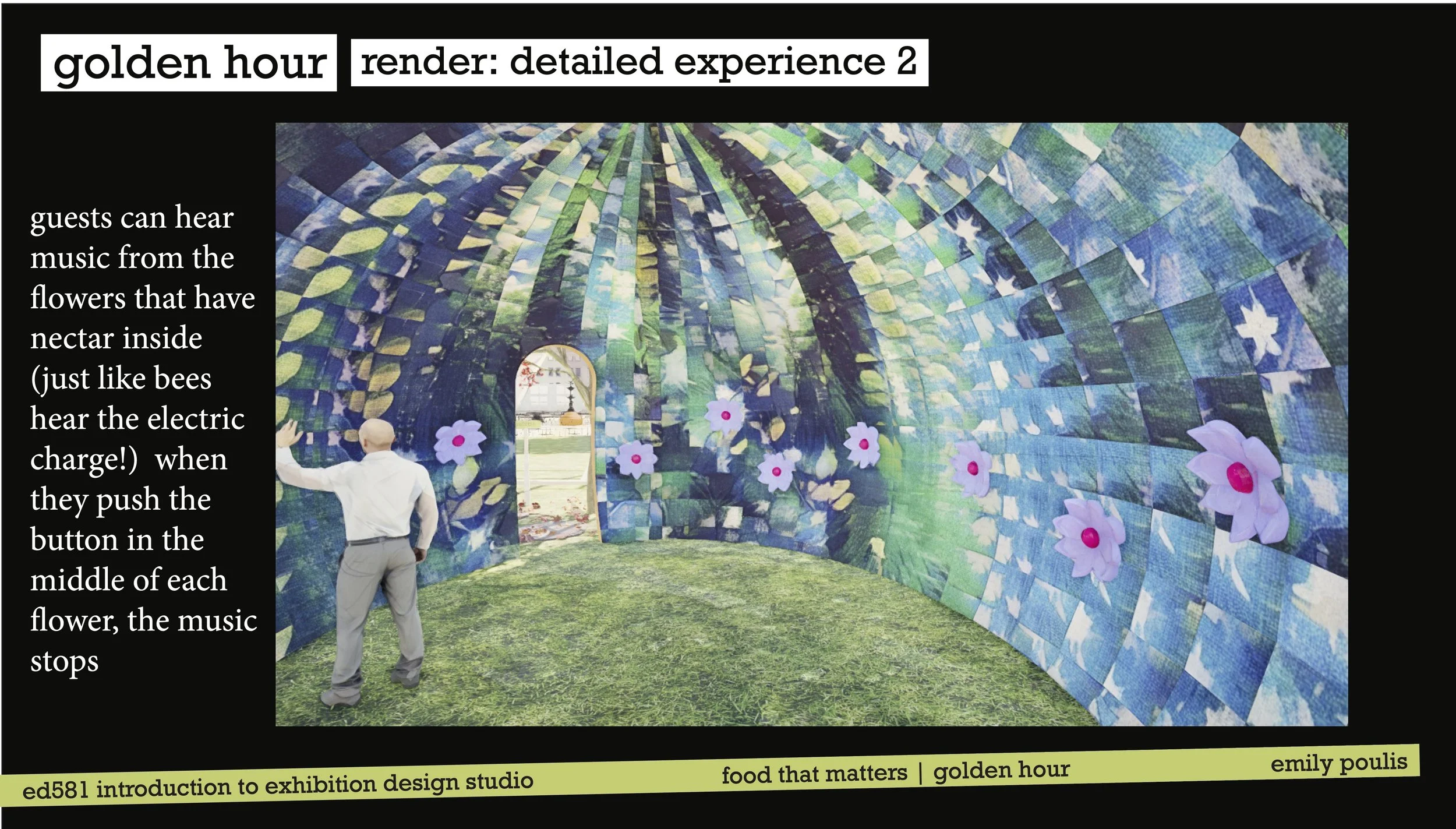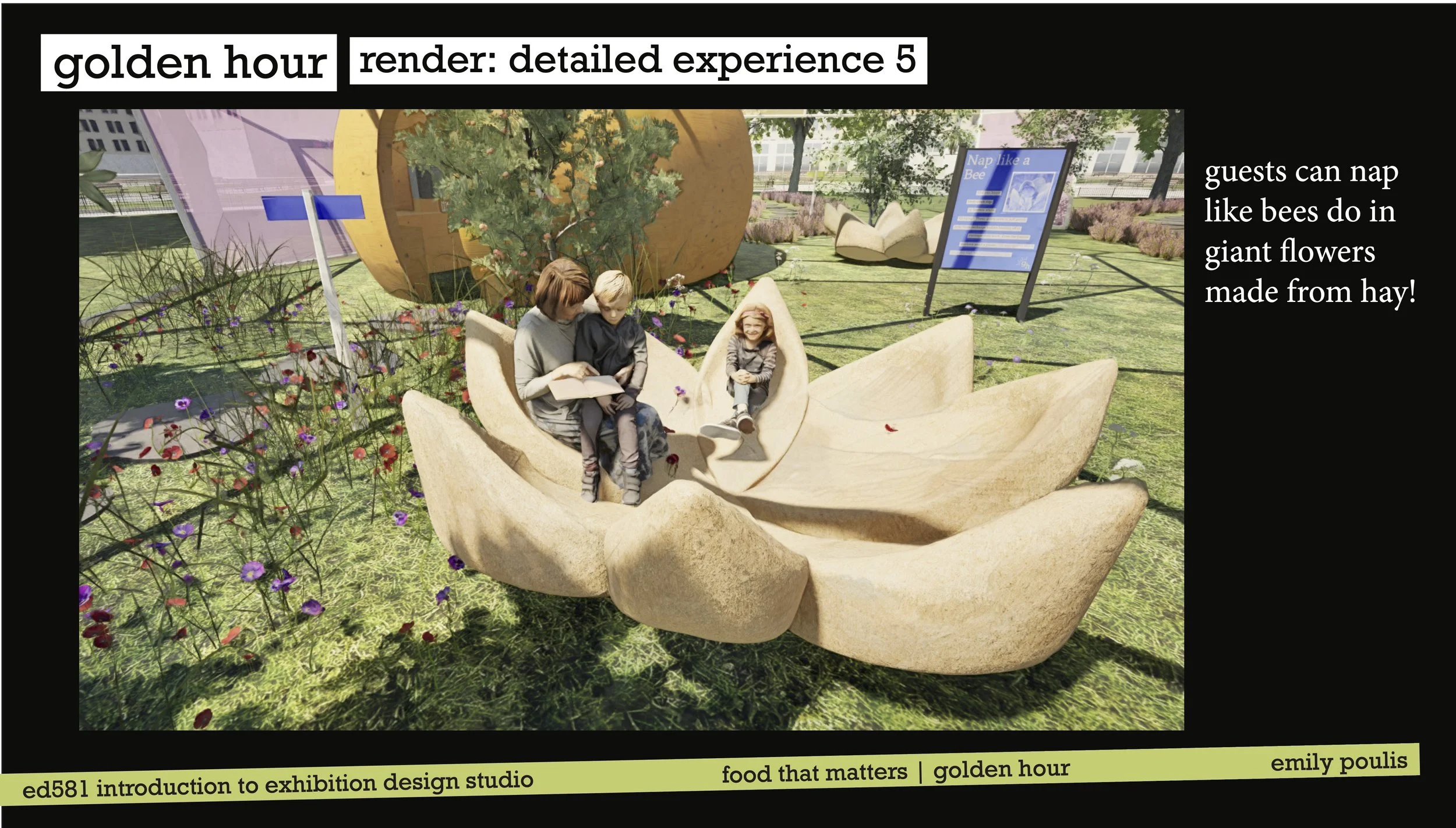 Visitors will start with Spring, where they help build the hive by melting warm wax into jars, laying the foundation for honeycomb. In Summer, they step into a digital meadow of musical flowers, each one humming with hidden nectar. By pressing a petal, they quiet the bloom, just as bees do when sensing the perfect time to gather. In Fall, guests follow glowing arrows across the ground, performing a lively waggle dance to communicate their discovery of a new home. Finally, in Winter, visitors are invited to taste the honey they helped bring to life, then curl up in oversized hay-filled flower pods for a well-earned nap, resting like bees as the season winds down.
